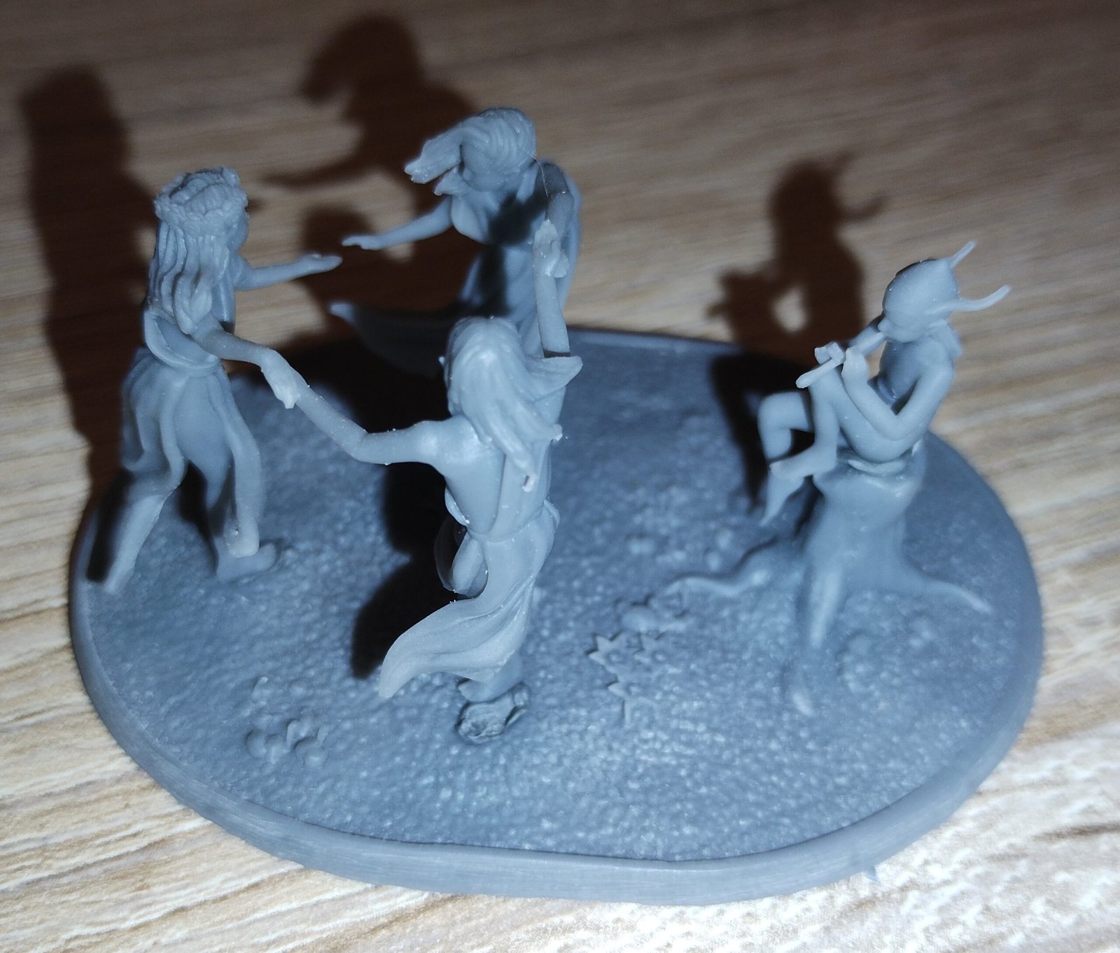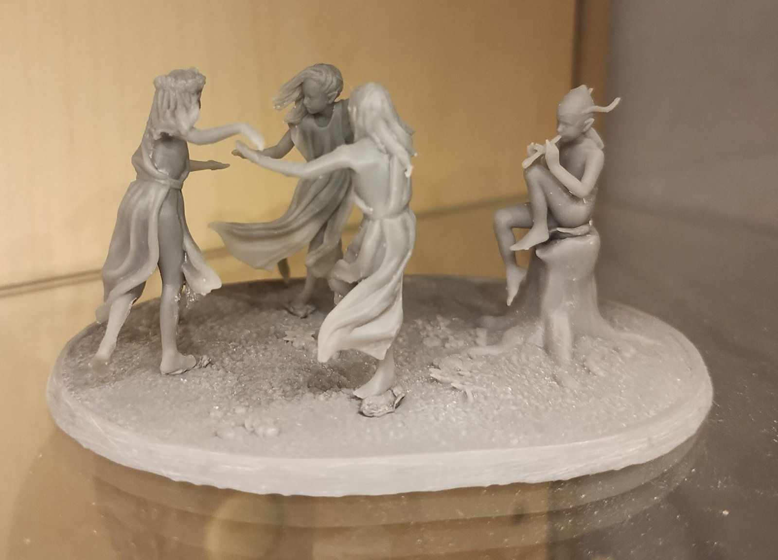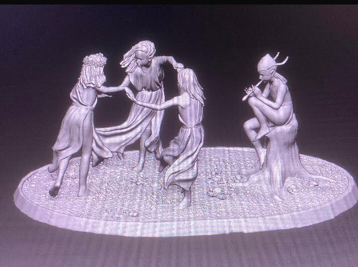This figure depicts three elf maiden dancing at the music of the flute played by a little elf boy. It is a gift sent by Chris Tubb to some long time collectors. it is supposed to be a part of the Phaeton range and the base indicates PS14 below